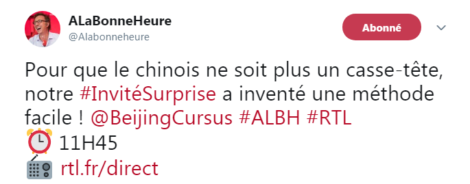Un vendredi 13 porte-bonheur en ce mois d’avril où la fondatrice de Beijing Cursus a eu l’immense privilège d’être l’invitée surprise dans l’emblématique émission de Stéphane Bern, A la bonne heure sur RTL !