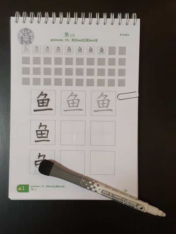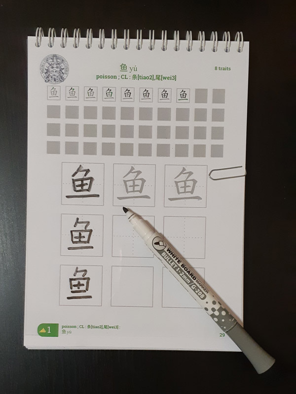 Grâce au feutre effaçable fourni, écrivez autant de fois qu’il est nécessaire pour bien mémoriser l’ordre et le sens des traits pour chaque caractère.