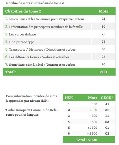- de 7 chapitres thématiques présentant, de façon progressive et illustrée, 200 mots dont les 150 exigés au HSK 2.