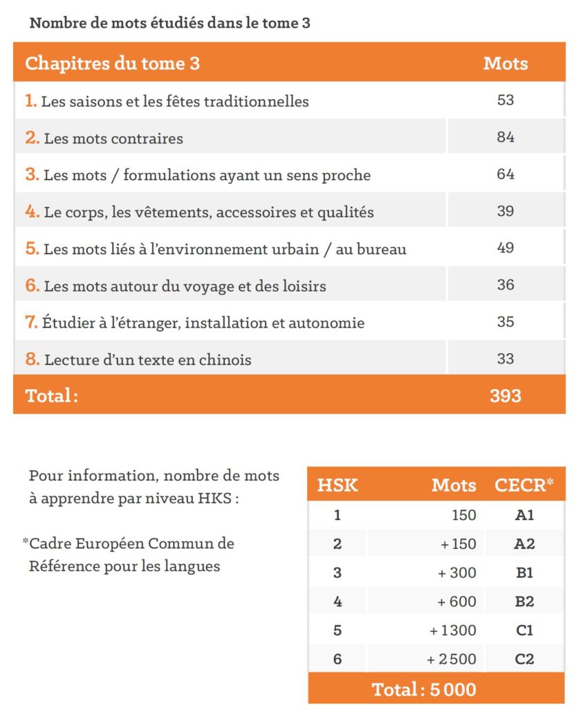 Ce tome 3 correspond au niveau HSK 3, soit intermédiaire du test international d’aptitude au chinois (niveau B1 du CECR). Il permet de continuer à acquérir les bases indispensables du chinois, à l’oral comme à l’écrit. La rubrique “Culture +” vient agréablement et utilement enrichir les connaissances sur la Chine d’hier et d’aujourd’hui.